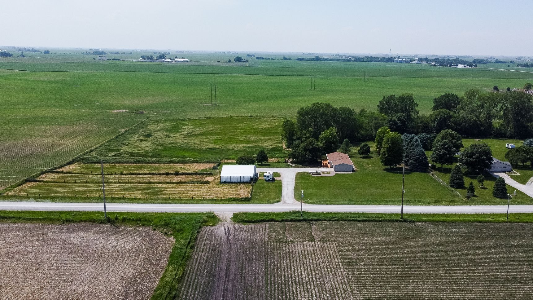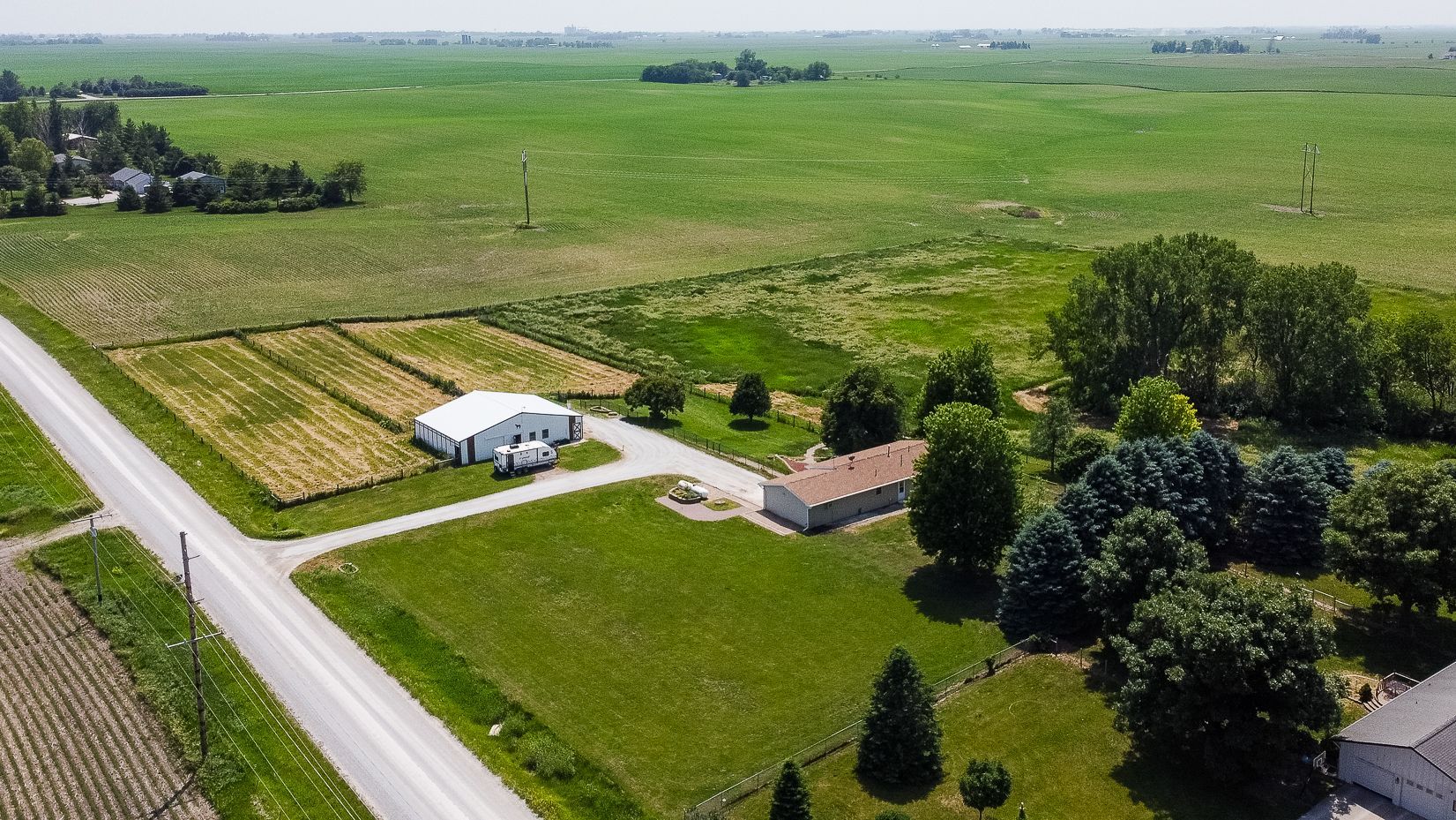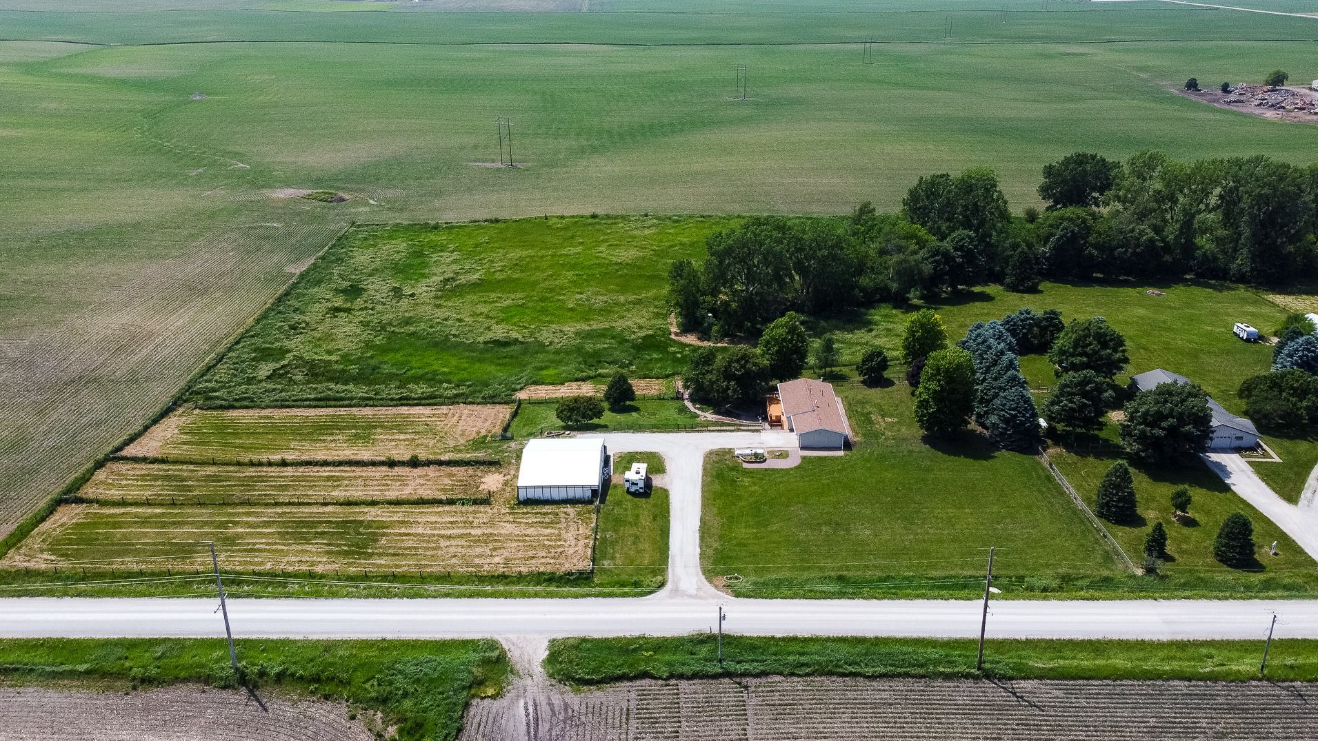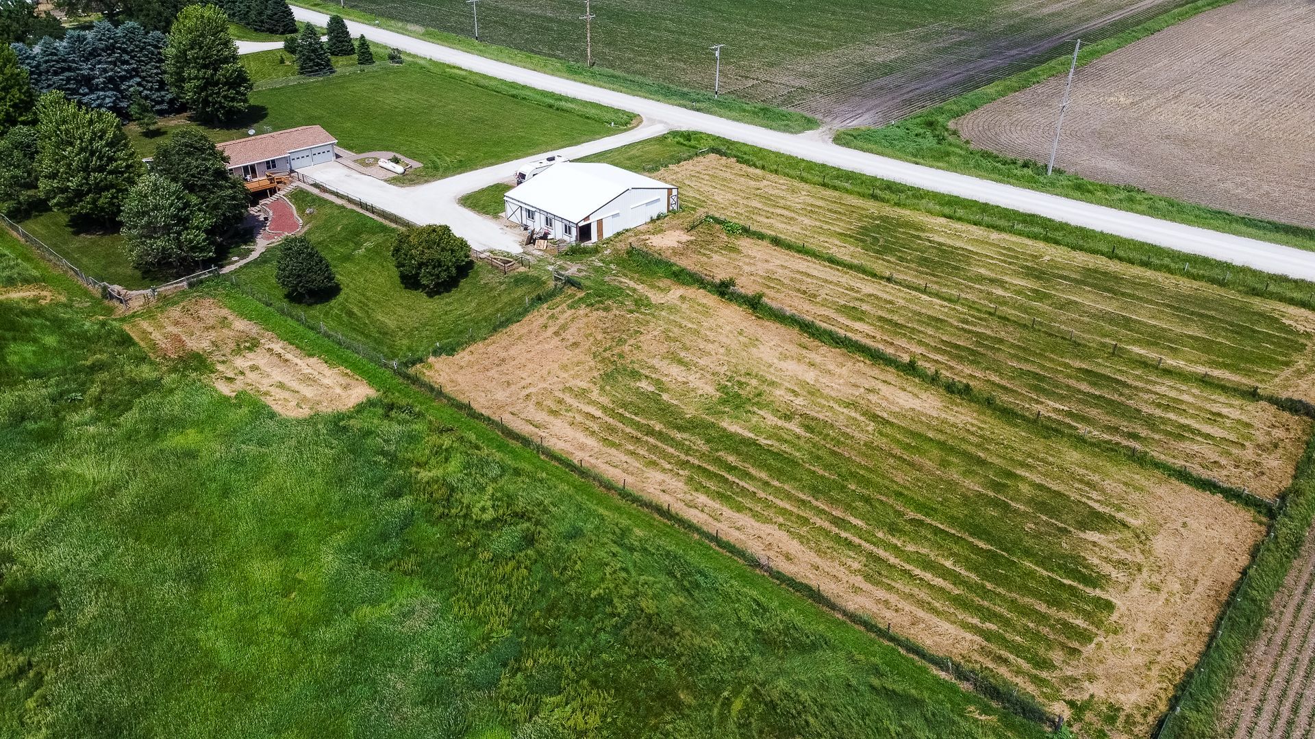 Endless possibilities on nearly 8 Acres between Ames & Huxley! This unique 7.92 horse acreage offers the perfect blend of peaceful rural living and convenient access to city amenities. Nestled on almost 8 acres in a prime central location, the property is ideal for horse enthusiasts, hobby farmers, or anyone seeking space and privacy.The barn is equipped with five stalls (inc. three private paddocks) a chicken area, & hay/farm equipment storage area. The 2000sf barn is ready for your animals—or for generating income from local boarders - Less than 10 min drive for ISU boarders! The yard just east of home is a perfect spot for a round horse pen; the 50-amp camper hookup is just north of barn. The home features include Pella windows, Shrock cabinetry, Bosch d/w, full size fridge/freezer, two sets of w/d, and vinyl plank flooring on the main level. Enjoy the benefits of updated mechanicals, including an updated roof (2017) new heat/AC (2018) and updated low maintenance decking and chain link fencing. Three bedrooms on the main floor & 1.5 bath. The lower level includes a walk out basement with apartment with kitchenette, full bath and non-conforming bedroom, offering potential for guests or rental income. Property has great bones but does need cosmetic updates & a vision for the LL. Whether you dream of a homestead, income property, or peaceful retreat, this acreage delivers unmatched opportunity in a sought-after location.